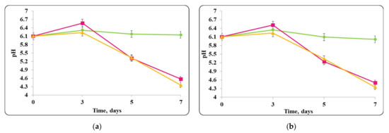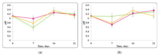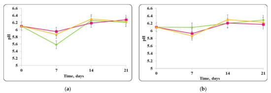 (a) free lactobacilli cells; (b) encapsulated lactobacilli cells. Changes in the pH of the chocolate mousse inoculated with Lb. helveticus 2/20 and S. aureus ATTC 25923 during storage at 20 ± 2 °C. Legend: Green ◆: pH of chocolate mousse inoculated with Lb. helveticus 2/20; Pink ■: pH of chocolate mousse co-inoculated with Lb. helveticus 2/20 and S. aureus ATCC 25923; Yellow ▲: pH of chocolate mousse inoculated with S. aureus ATCC 25923.