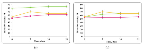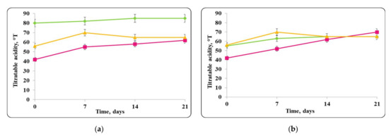 (a) free lactobacilli cells; (b) encapsulated lactobacilli cells. Changes in the total titratable acidity of MRS broth inoculated with Lb. helveticus 2/20 and S. aureus ATTC 25923 during storage at 4 ± 2 °C. Legend: Green ◆: TA of MRS broth inoculated with Lb. helveticus 2/20; Pink ■: TA of MRS broth co-inoculated with Lb. helveticus 2/20 and S. aureus ATCC 25923; Yellow ▲: TA of MRS broth inoculated with S. aureus ATCC 25923.
