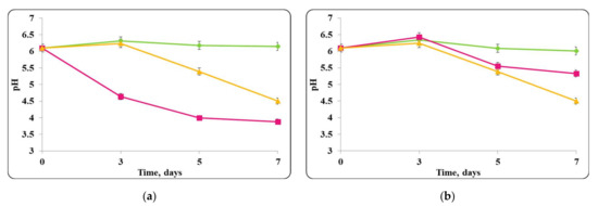 (a) free lactobacilli cells; (b) encapsulated lactobacilli cells. Changes in the pH of chocolate mousse inoculated with Lb. helveticus 2/20 and E. coli ATCC 25922 during storage at 4 ± 2 °C. Legend: Green ◆: pH of chocolate mousse inoculated with Lb. helveticus 2/20; Pink ■: pH of chocolate mousse co-inoculated with Lb. helveticus 2/20 and E. coli ATCC 25922; Yellow ▲: pH of chocolate mousse inoculated with E. coli ATCC 25922.