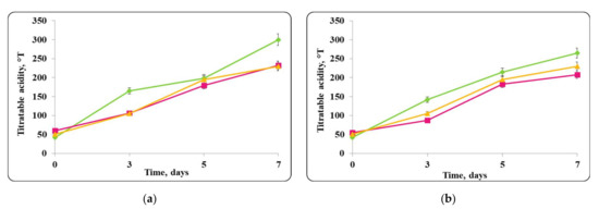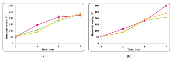 (a) free lactobacilli cells; (b) encapsulated lactobacilli cells. Changes in the total titratable acidity (TA) of MRS broth inoculated with Lb. helveticus 2/20 and E. coli ATCC 25922 during storage at 20 ± 2 °C. Legend: Green ◆: TA of MRS broth inoculated with Lb. helveticus 2/20; Pink ■: TA of MRS broth co-inoculated with Lb. helveticus 2/20 and E. coli ATCC 25922; Yellow ▲: TA of MRS broth inoculated with E. coli ATCC 25922.