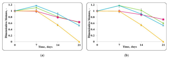 (a) free lactobacilli cells; (b) encapsulated lactobacilli cells. Changes in the dimensionless biomass of Lb. helveticus 2/20 and E. coli ATCC 25922 in MRS broth at 4 ± 2 °C. Legend: Green ◆: Lb. helveticus 2/20 population following its inoculation; Pink ■: Lb. helveticus 2/20 population following its co-inoculation with E. coli ATCC 25922; Blue ×: E. coli ATCC 25922 population following its direct inoculation; Yellow ▲: E. coli ATCC 25922 population following its co-inoculation with Lb. helveticus 2/20.