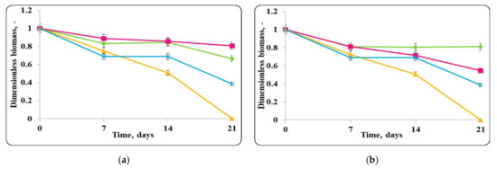 (a) free lactobacilli cells; (b) encapsulated lactobacilli cells. Changes in the dimensionless biomass of Lb. helveticus 2/20 and E. coli ATCC 25922 in chocolate mousse at 4 ± 2 °C. Legend: Green ◆: Lb. helveticus 2/20 population following its inoculation; Pink ■: Lb. helveticus 2/20 population following its co-inoculation with E. coli ATCC 25922; Blue ×: E. coli ATCC 25922 population following its direct inoculation; Yellow ▲: E. coli ATCC 25922 population following its co-inoculation with Lb. helveticus 2/20.