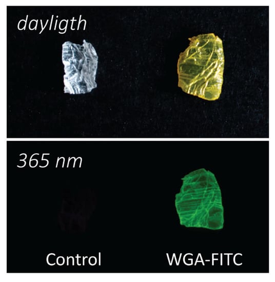 The hierarchically-organized chitin-based matrix was obtained from the blade of the squid pen of Loligo vulgaris after deproteination by the alkaline treatment [17,46,51,71]. This treatment resulted in a final degree of acetylation of about 88% (acetyl groups on sugar monomer number) [51]. Before exposing the matrix to the lectin, it was swelled in an HCl solution at pH 2, a treatment observed to increase the swelling of β-chitin matrices. This swelling was maintained by moving the matrix to higher pH solutions [17,72]. The matrix was then treated with a WGA-FITC solution 0.5 mg·mL−1 with a protein/chitin ratio of 5 wt.% for 72 h in a buffered environment at pH 7.4. In the end, the WGA-FITC bonded to the matrix was 3.3 ± 0.4 wt.% of WGA-FITC, corresponding to 65 ± 9% of the protein in the initial loading solution. The functionalized matrix appeared bright yellow in daylight and showed fluorescence under UV light, Figure 1. A control using pristine WGA, not functionalized with FITC, was carried out to evaluate eventual adsorption differences due to the FITC functionalization. The binding was assessed using the 280 nm absorption band of the protein. No significant difference was found, being 70 ± 10% of the WGA absorbed in the same experimental condition.