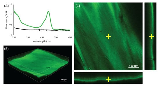 UV-Vis spectroscopic analyses of the matrix. (A) UV-Vis spectra of the blank control (black line) and the WGA-FITC treated (green line) chitin samples. The confocal analyses of a wet WGA-FITC treated sample are shown, and both the (B) 3D model and (C) sections along different planes are reported.
