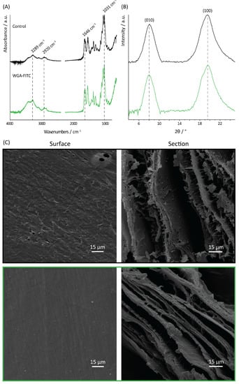 Structural and morphological analyses of the matrix. (A) FTIR, (B) XRD, and (C) SEM analyses of the blank chitin control (black line) and the WGA-FITC-treated chitin samples (green line). Surface image magnification is 800X and the cross-section image magnification is 1000X.