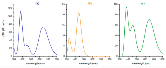 To accurately describe the photophysical properties of the systems under investigation, a preliminary benchmark study was carried out on the BDP absorption spectrum and compared with an experimentally available one obtained in acetonitrile solvent [33]. The appropriate protocol was selected on the basis of the reproduction of the maximum absorption wavelength (λmax), one of the key parameters for PDT application. The performance of several exchange and correlation functionals was evaluated and the results are collected in Table S1. B3LYP functional was, thus, selected for all the calculations carried out on the systems under investigation. In particular, the calculated λmax for BDP is in excellent agreement with the experimental value (644 and 641 nm, respectively). The calculated UV–vis spectra for the two precursors, BDP and Ru, and for the Ru-BDP conjugate, computed in the solvent water to mimic the physiological environment, are reported in Figure 1.