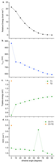(a) relative energy of each scan point with respect to the most stable semi-relaxed structure, (b) maximum absorption wavelength, (c) triplet states energy and (d) SOCs computed for the accessible ISC channels.
