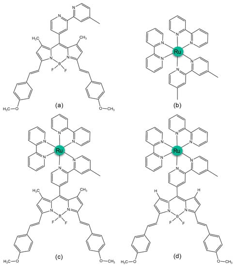 Schematic representation of the investigated molecules (a) BDP (b) Ru (c) Ru-BDP and (d) Ru-HBDP.