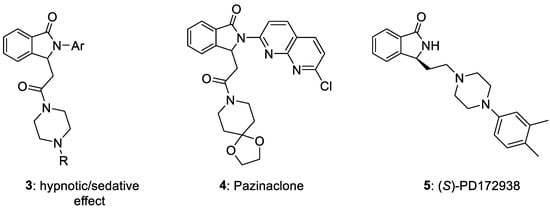 Over the past few years, the isoindolinone ring system has emerged as a valuable pharmacophore, exhibiting a wide range of therapeutic activities including antimicrobial, antioxidant, antifungal, anti-Parkinson, anti-inflammatory, antipsychotic, antihypertensive, anesthetic, vasodilatory, anxiolytic and antiviral activities [14,15]. In particular, isoindolinones 3 [16,17,18] and 4 (Pazinaclone) [19,20] are benzodiazepine-receptor agonists for the treatment of anxiety, while compound (S)-5, developed by Belliotti et al., known as (S)-PD172938, is a potent dopamine D4 ligand (Figure 2) [21,22].
