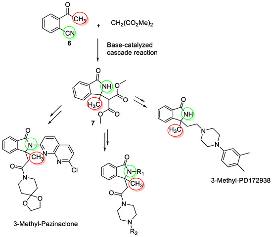 Based on our continuing research interest in the synthesis of isoindolinones [31,32,33,34,35], we report the application of our efficient and practical K2CO3 promoted a cascade reaction to the first synthesis of 3-methylated analogs of Pazinaclone, PD172938 and related structures (Scheme 1). An efficient asymmetric synthesis of 3-methylated analog of (S)-PD172938 was also developed based on the combination of the asymmetric-phase transfer catalysis process and a recrystallization step.