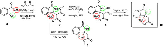 The first part of the investigation focused on the large-scale synthesis of 3-substituted isoindolinone 7, which was conveniently obtained in the presence of the K2CO3-promoted cascade reaction of readily available 2-acetylbenzonitrile 6 and dimethylmalonate in acetonitrile (Scheme 2). This compound proved to be particularly convenient in the synthesis of a series of novel analogs of bioactive 3-substituted isoindolinones, based on the transformation of 7 into the monocarboxylic derivative 10. For this purpose, several methods were investigated. Decarboxylation of 7 under reflux in 6M HCl solution led to complex mixtures of products, while the treatment of 7 with a LiCl/H2O/DMSO mixture at 130 °C, a method known as Krapcho decarboxylation [36,37], allowed for obtaining the ester 8 in a 70% yield. However, a higher yield of 10 was achieved in a two-step process comprising a saponification followed by simple heating of the dicarboxylic acid 9 in CH3CN (Scheme 2).