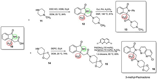 NH arylation of the lactams 12 and 15 required several efforts too (Scheme 3). In contrast with arylation of 3-mono-substituted isoindolinones [22,30], phenylation of the lactam 12 was performed using a ligand-less cross coupling reaction based on the Cu(I)-catalyzed arylation of amides [39] in a very good 81% yield, allowing for access to the 3-methylated analog 13 of a hypnotic sedative drug (Figure 2). In the synthesis of 3-methyl-Pazinaclone 16, the palladium-catalyzed Buchwald–Hartwig reaction of the lactam 15 in the presence of Xantphos [40] was necessary with the less reactive 1,8-dichloronaphthiridine, while the use of BINAP as ligand or Cu(I)-catalyzed arylation reactions were not effective.