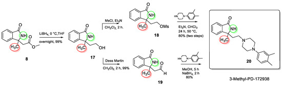First of all, ester 9 was chemoselectively reduced by LiBH4 in quantitative yield. Subsequent mesylation of the alcohol 17 and displacement of the mesyl group with the 3,4-dimethylphenylpiperazine led to 3-methyl-PD172938 20 in a high overall yield. For this purpose, it has to be noted that the sequential one-pot mesylation/piperazine displacement gave sluggish results (addition of piperazine at the end of mesylation reaction). Purification of 18 on silica gel led to decomposition products, while purification on Florisil afforded 18 in a good 73% yield. However, the best results were obtained treating the crude product 18 with 3,4-dimethylphenylpiperazine at 50 °C in CHCl3, leading to the target 3-methyl-PD172938 20 with 80% overall yield for two consecutive steps. Alternatively, compound 20 can be afforded with similar level of efficiency by reductive amination of the aldehyde 19 with NaBH4 in the presence of 3,4-dimethylphenylpiperazine. The aldehyde 19 is readily accessible in quantitative yield by Dess–Martin oxidation of the alcohol 17, while the reduction of 8 in 19 was not attempted since DIBAL-H is not selective in the presence of amides [41].