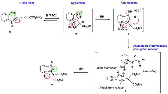 Then, the asymmetric synthesis 3-methylated analog of (S)-PD172938 was developed. For direct applications in medicinal chemistry programs, the ability to selectively construct a new stereocenter with enantiocontrol is of great importance. Since convenient methods for the asymmetric synthesis of the key intermediate 8 and related compounds bearing a tetrasubstituted stereocenter are not available, we considered the previously investigated asymmetric cascade reaction of readily available 2-acetylbenzonitrile and dimethylmalonate for the direct access to enantioenriched 7 (Scheme 5 and Scheme 6) [33]. The development of an effective asymmetric version of this cascade reaction proved to be particularly challenging. A large number of chiral neutral bifunctional organocatalysts and chiral ammonium salts were tested under a range of conditions [33]. The best results were obtained in the presence of the chiral bifunctional ammonium salt 21-derived form (S,S)-1,2-cyclohexanediamine and K2CO3 as the inorganic base in CH2Cl2 under phase transfer conditions (Scheme 5 and Scheme 6), leading to moderate enantioselectivity [33]. The possibility to easily synthesize catalyst 21 in high scale [42] allowed us to conveniently scale up the cascade process to 1.72 mmol of 2-acetylbenzonitrile. Despite the moderate enantioselectivity also achieved on a large scale, the advantage of the entire process relies on a very effective and reproducible process of enantio-enrichment by crystallization, increasing the ee of 7 up to 94% in an acceptable overall yield (Scheme 6). In addition, the chiral ammonium salt 21 was recovered after the chromatography in 75% yield and reused with similar level of enantioselectivity, with the possibility to improve the efficiency of the process. The absolute configuration of compound (+)-7 was previously established to be (R) by VCD measurements when (S,S)-21 is used [33]. This is an important finding since in the present investigation, we used (R,R)-21 to synthesize 7 with (S) configuration. The knowledge of absolute configuration allowed us to propose a plausible transition state for the enantioselective determining step (Scheme 5). A combination of both ionic and hydrogen bond interactions with 21 should favor the intramolecular aza-Michael reaction from the re face of prochiral intermediate c leading to 7 (Scheme 5). The mechanism of the reaction is proposed based on previous experimental [31,33] and theoretical studies [32]. After deprotonation of dimethylmalonate, the resulting carboanion leads to carbonyl addition to ketone, followed by cyclization at cyano group and formation of the cyclic imidate b, which will give then rearrangement to the final product 7.