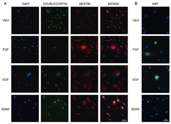 Olfactory neuronal precursors proliferate in culture and form spherical clusters that express nestin [14]. These cells are mitotically active and incorporate BrdU [14]. On the other hand, EFG, FGF, and BDNF stimulate neurogenesis in cultured hippocampal stem cells as well as in the dentate gyrus of the hippocampus in mice [24,25,26,27]. Thus, we tested whether the effects of neuronal growth factors on neurogenesis observed in the mice hippocampus were also elicited in cultured ONPs. For this, we incubated the ONPs with the VEH, or 20 ng/mL of either FGF, EFG, or BDNF, during 6 h. Cell cultures were then stained with antibodies raised against nestin and doublecortin, which are markers of progenitor cells and neurogenesis, respectively [28,29]. Figure 1A shows that ONPs incubated with FGF, EFG, or BDNF formed clusters with a diameter larger than 50 µm. In contrast, a single cell has 10 µm in diameter. Clusters observed in cultures incubated with FGF, EGF, or BDNF were also positive for anti-Ki67 antibody staining, which labels the nuclei of proliferating cells (Figure 1B). Some clusters were not stained with the anti-Ki67 antibody (see FGF Panel). Data suggest that FGF, EGF, and BDNF stimulate neurogenesis in cultured ONPs.