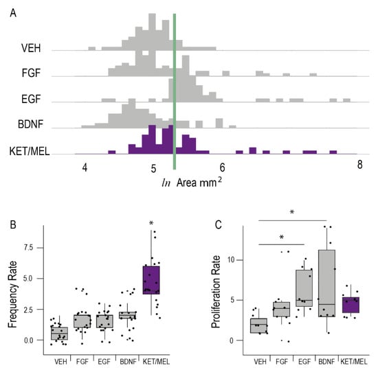 Comparison of the effects of KET/MEL combination with the effects of growth factors on neurogenesis. Olfactory neuronal precursors were cultured with the vehicle (VEH), fibroblastic growth factor (FGF), epidermal growth factor (EGF), brain-derived neurotrophic factor (BDNF) or the combination of ketamine and melatonin (KET/MEL) during 6 h. The cluster area (Panel A); the frequency of cluster formation (Panel B); and the proliferation rate (Panel C), were determined as described in the Materials and Methods section. The experiment was repeated twice, and data were analyzed using Kruskal–Wallis test followed by Dunn´s multiple comparison test. Results are expressed as median ± Tukey intervals. * Asterisks indicate significant differences with p < 0.05.