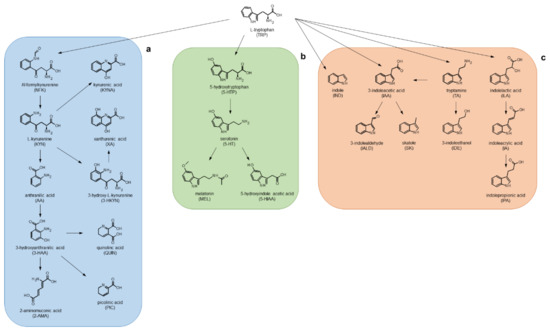 Schematic illustration of TRP metabolism through the (a) KYN and (b) 5-HT pathways, and (c) gut TRP catabolism.