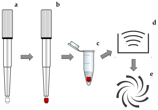 Representation of VAMS workflow: (a) Unused VAMS sampler, (b) VAMS sampler after accurate collection of 10 μL whole blood and drying at RT, (c) sampled VAMS tips extracted in a proper extraction media under (d) UAE and (e) VAE.