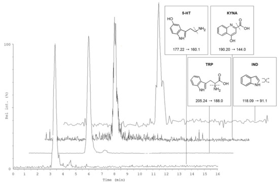In these working conditions, TRP-related compounds produced sharp and symmetric peaks for all analytes, with a total chromatographic run of 16 min, with sufficient sensitivity and selectivity.