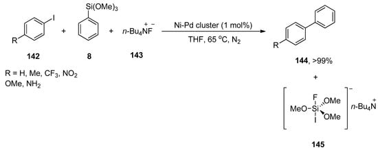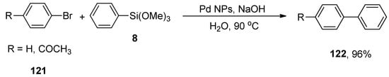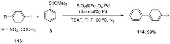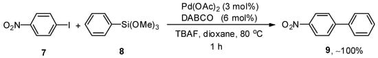 Palladium-catalyzed Hiyama cross-coupling reactions have extensively been employed for the synthesis of biaryl derivatives due to characteristic features of organosilane reagents such as non-toxicity, ease of access, high sustainability, and low cost [,,]. Li and coworkers evaluated the catalytic efficacy of Pd(OAc)2/DABCO for the reaction of aryl halides and aryltrimethoxysilanes. This methodology covered a wide substrate scope by the addition of aryl bromides and iodides to aryl trialkoxysilanes giving biaryl derivatives in a moderate to excellent yield range (20–100%). Different solvents, including dioxane, MeCN, THF, acetone, and DMF, were investigated, and dioxane gave the highest yield. Out of the three different bases (KF, TBAF, and K2CO3), TBAF was selected as a suitable base for this reaction. A reference example is highlighted in Scheme 2. p-Iodonitrobenzene 7 was coupled with phenyl trimethoxysilane 8, affording the corresponding cross-coupled product 9 with quantitative yield. The coupling proceeded at 80 °C for 1 h using Pd(OAc)2 (3 mol%), DABCO (6 mol%), and tetrabutylammonium fluoride (TBAF) in dioxane [].