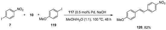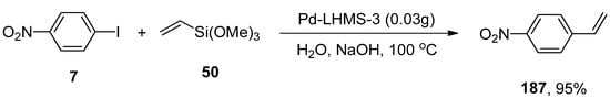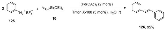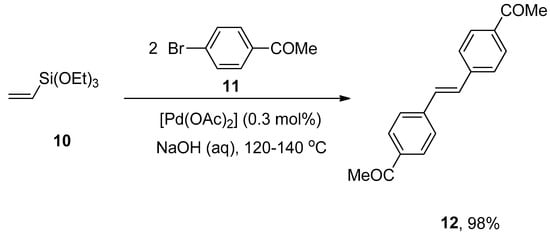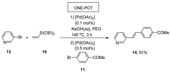 A facile and effective protocol for the synthesis of symmetrically and asymmetrically functionalized (E)-1,2-diarylethenes by sequential one-pot Hiyama–Heck reactions was disclosed by Gordillo et al. The reaction proceeded in aqueous and ligand-free conditions. The symmetric (E)-1,2-diarylethene 12 was synthesized via one-pot Hiyama vinylation and Heck arylation of triethoxy(vinyl)silane 10 and aryl bromide 11 using Pd(OAc)2 (0.3 mol%) and NaOH in 98% yield with selectivities (100:0), respectively (Scheme 3). For the synthesis of asymmetric (E)-1,2-diarylethene via one-pot Hiyama vinylation reaction, a different strategy was developed in which treatment of 3-bromopyridine 13 with triethoxy(vinyl)silane 10 by using Pd(OAc)2 aqueous NaOH and PEG followed by the Heck arylation in H2O afforded 100% conversion with 91% yield of corresponding asymmetric (E)-1,2-diarylethene 14 (Scheme 4). Bromoarenes containing electron-donating and electron-withdrawing groups provided asymmetric (E)-1,2-diarylethenes in a moderate to excellent (71–91%) yield range [].