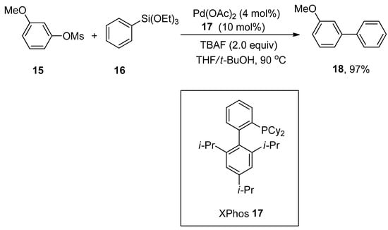 The combination of palladium acetate with XPhos exhibits high efficacy in Hiyama cross-coupling of aryl mesylates and arylsilanes to generate corresponding biaryl derivatives in a 40–97% yield range. Wu and coworkers developed a general and efficient synthetic route for synthesizing the substituted biaryl compounds by palladium-catalyzed Hiyama cross-coupling reaction of unactivated aryl mesylates with arylsilanes. Various substituted aryl mesylates containing either electron-rich or electron-poor groups furnished the corresponding biaryl products in 40–97% yields. Maximum yield (97%) was attained in the case of coupling of methoxy substituted aryl mesylate 15 with triethoxy(phenyl)silane 16 using 4 mol% of Pd(OAc)2 as a catalyst, 10 mol% of XPhos 17 as ligand, and 2.0 equivalents of tetra-n-butylammonium fluoride (TBAF) as an additive in THF/t-BuOH mixture at 90 °C (Scheme 5) [].