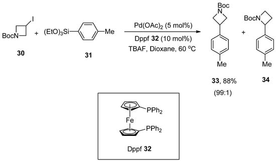 Azetidines are distinctly comprised of four-membered azaheterocycle motifs due to possessing numerous chemical properties and ring strain [,]. Arylazetidine scaffolds are significant building modules and exhibit a diverse range of biological activities [,,,,,]. A convenient approach toward the synthesis of a variety of 3-arylazetidines derivatives through Hiyama coupling of 3-iodoazetidines with arylsilanes in mild reaction conditions was reported by Zou and coworkers. Triethoxy(phenyl)silane with electron-donating and -withdrawing substituents afforded the products moderate to excellent yields (30–88%). 1-Boc-3-iodoazetidine 30 was allowed to couple with 4-methylphenyltriethoxysilane 31 in the presence of Pd(OAc)2 catalyst (5 mol%), phosphine ligand (10 mol%) 32, tetra-n-butylammonium fluoride (TBAF in THF) and dioxane under argon atmosphere to obtain the targeted product 33 in an excellent (88%) yield along with 34 in 99:1 ratio, respectively (Scheme 9). The substrate scope of heterocycloalkyl iodides was observed under optimized conditions. The desired coupling products were obtained in a 33–85% yield range [].