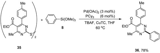 Dihetaryl disulfides possessing pyrimidine rings exhibit diversified biological and pharmacological activities [,,], such as antifungal, antibacterial, and calcium-channel modulation []. An interesting and modular strategy for the formation of carbon–carbon bonds to produce potent biologically active compounds through palladium-catalyzed copper-promoted Hiyama cross-coupling reaction has been reported by Liu et al. Dihetaryl disulfides containing electron-rich and electron-poor substituents in the para-positions of benzene rings afforded corresponding products in moderate yield range. A maximum yield (78%) of 36 was observed in the case of cross-coupling of dihetaryl disulfide 35 with trimethoxy(phenyl)silane 8 using 3 mol% Pd(OAc)2 catalyst, an efficient activator copper (I) thiophene-2-carboxylate (CuTC), TBAF and 6 mol% PCy3 ligand using THF as the only solvent (Scheme 10) [].