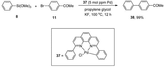 The palladium NNC-pincer complex was found to be an efficient catalyst precursor for the generation of monomeric palladium(0) species. The applications of palladium NNC-pincer complex as a catalyst in the allylic arylation of allyl acetates with sodium tetraarylboronates [] and in the Heck reaction of aryl halides with activated alkenes [] gained tremendous importance in recent years. Keeping its efficiency under consideration, Ichii et al. synthesized corresponding biaryls via palladium NNC-pincer complex catalyzed Hiyama coupling reactions of aryl bromides with aryl(trialkoxy)silanes. Bromobenzenes having electron-donating and electron-withdrawing substituents resulted in a moderate to excellent yield range (39–99%) of biaryl products. The substituted aryl bromide 11 was allowed to couple with phenyl trimethoxysilane 8 using 5 mol ppm of palladium complex 37. KF was selected as a suitable base for the corresponding reaction. The maximum yield (99%) of biaryl derivative 38 was observed using propylene glycol as an effective solvent (Scheme 11) [].