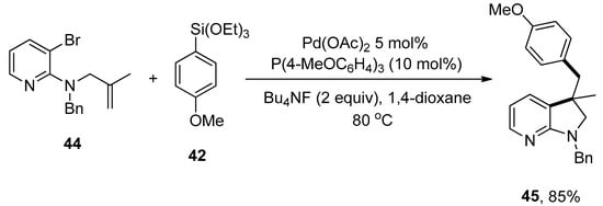 The azaindoline framework is a nitrogen-bearing heterocycle that exists in several complex compounds and exhibits numerous biological and pharmaceutical attributes []. Keeping these characteristics in mind, Ye et al. disclosed the formation of azaindoline derivatives, which was carried out by the Domino Heck cyclization/Hiyama coupling protocol. A number of functionalized azaindoline derivatives were achieved in 46–85% yields. A series of ligands (PPh3, P(2-furyl)3, XPhos, SPhos, P(4-MeOC6H4)3 were screened, and the electron-rich P(4-MeOC6H4)3 was declared as a suitable ligand for the corresponding reaction. The reaction of Bn-protected aminopyridine 44 and 4-methoxy substituted phenyltriethoxysilane 42 was progressed in 1,4-dioxane using 5 mol% Pd(OAc)2 catalyst and 2.0 equivalents of Bu4NF. The targeted coupling product 45 was furnished in 85% yield by maintaining the temperature at 80 °C (Scheme 14). Excellent results (46–85%) were obtained in the case of electron-donating (phenyl, OMe, CH3) and -withdrawing (F, CF3, Cl) substituents. Moreover, heteroarylsilanes, including 2-thienylsilane and 3-thienylsilane, provided access to targeted products in 77% and 82% yields, respectively [].