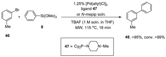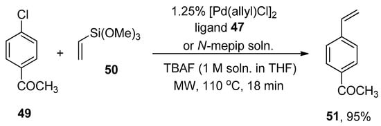 Clark, in 2005, reported the Hiyama cross-coupling under microwave irradiation for the first time. The microwave-assisted reaction of 3-bromotoluene 46 was accomplished with phenyl trimethoxysilane 8 in the presence of 1.25% [Pd(allyl)Cl]2, ligand 47/N-mepip solution and tetra n-butylammonium fluoride (TBAF) promoter (1 M soln. in THF) to achieve the targeted coupling product 48 in >95% yield with >99% conversion (Scheme 15). A fascinating application of Hiyama coupling involves the synthesis of arylalkenes. In this regard, para-chloroacetophenone 49 underwent cross-coupling with vinyltrimethoxysiloxane 50 utilizing catalyst derived from 1.25% [Pd(allyl)Cl2] and ligand 47/N-mepip solution using TBAF in THF at 110 °C under microwave irradiation to afford colorless styrene derivative 51 in 95% yield (Scheme 16) [].