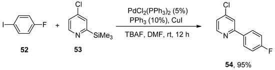 Organosilanes have attracted the attention of research groups due to their assorted benefits (such as low cost, ease of availability, nontoxic byproducts, and stability) as compared to the other organometallic precursors (organoboron, organostannane, organozinc, organotin). Unsuccessful attempts to couple 2-trimethylsilylpyridine with 4-iodoanisole diverted the attention of researchers towards sustainable liquids, i.e., chloropyridyltrimethylsilanes for Hiyama cross-coupling reaction. Chloropyridyltrimethylsilanes could be afforded either by halogen or hydrogen lithium exchange of chloropyridines followed by the reaction with chlorotrimethylsilane. Pierrat et al., in 2005, disclosed the Hiyama cross-coupling of chloro-substituted pyridyltrimethylsilanes with aryl halides. 1-Fluoro-4-iodobenzene 52 was allowed to react with chloro substituted pyridyltrimethylsilanes 53 using 5% PdCl2(PPh3)2, 10% PPh3, and copper iodide (1 equiv) to carry out the coupling in DMF solvent. The reaction was conducted using two equivalents of tetra-n-butylammonium fluoride (TBAF in THF) as a suitable base at room temperature for 12 h, affording the targeted biaryl product 54 in 95% yield (Scheme 17) [].