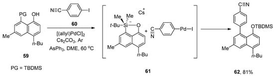 Multicomponent assembly protocol fascinates synthetic chemists due to its efficacy in the synthesis of molecular complexity and is acceptable for diversity-oriented synthesis [,]. An efficient approach for the synthesis of multisubstituted unsymmetrical biaryls was reported by Akai and coworkers in 2008. The reaction of substituted 8-TBDMS-1-naphthols with a wide range of aryl iodides afforded the biaryl derivatives moderate to excellent yields (46–81%). The fluoride-free Hiyama coupling of 59 was accomplished with 4-cyanoiodobenzene 60 giving a multisubstituted asymmetrical biaryl through the formation of pentacoordinate silicate 61 as an intermediate. [(allyl)PdCl]2, AsPh3, Cs2CO3, and dimethoxyethane (DME) were selected as an appropriate catalyst, ligand, base, and solvent, respectively, to afford the maximum yield (81%) of targeted asymmetrical biaryl derivative 62 under argon atmosphere (Scheme 19) [].