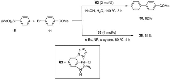 Pincer-type palladium complexes are intriguing due to their promising reactivity and stability. Inés et al. synthesized the non-symmetric PCN pincer-type palladium complex by the reduction of 1-(3-nitrophenyl)pyrazole to amine, which upon treatment with ClPPh2 provided an unreliable and air-sensitive ligand. The ligand further reacted with Pd(COD)Cl2 to yield a targeted non-symmetric pincer-type complex that efficiently catalyzed the Hiyama cross-coupling reaction in eco-friendly reaction media. Excellent results were achieved using two methods in the presence of an efficient catalyst. The first pathway was concerned with the reaction of phenyl trimethoxysilane 8 with 11 catalyzed by 2 mol% 63 using NaOH in H2O at 140 °C for 3 h to obtain the corresponding biaryl derivative 38 in 82% yield. The alternative developed method involved the coupling of phenyl trimethoxysilane 8 with 11 in the presence of 4 mol% of catalyst 63 using n-Bu4NF and o-xylene at 80 °C for 4 h to afford the required biaryl product 38 in 61% yield (Scheme 20) [].