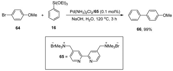 Chen et al. synthesized the sustainable cationic bipyridyl ligand by reacting 4,4′-bis(bromomethyl)-2,2′-bipyridine with 50% aqueous solution of trimethylamine in CH2Cl2 that catalyzed the Hiyama cross-coupling reaction efficiently. 4-Bromoanisole 64 was reacted with phenyl triethoxysiloxane 16 in H2O using Pd(NH3)2Cl2/65 (0.1 mol%) as a catalyst. NaOH was screened as a suitable base to attain the desired biaryl derivative 66 in 99% yield (Scheme 21). The Hiyama cross-coupling of several aryl bromides with a variety of triethoxy(aryl)silanes gave substituted biaryl derivatives in (35–99%) yield range [].