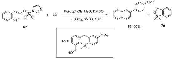 Aryl imidazol-1-ylsulfonates are the electron-deficient substrates that promote the palladium-catalyzed Hiyama and Sonogashira cross-coupling under copper-free conditions, as reported by Williams and coworkers. Several functionalized biaryl derivatives were obtained by the reaction of aryl imidazylates with (2-hydroxymethylphenyl) dimethyl silane (HOMSi) reagent in 72–99% yields. The 2-naphthyl imidazol-1-ylsulfonate 67 was coupled with 4-methoxyphenyl HOMSi reagent 68 in the presence of Pd(dppf)Cl2 (0.05 equiv) in dry DMSO with K2CO3 at 65 °C giving the cross-coupling product 69 in 99% yield (Scheme 22) [].