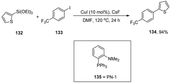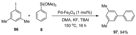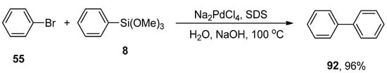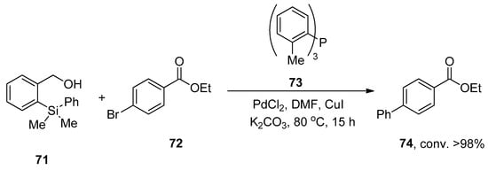 A research group by Hughes also reported a facile and convenient methodology for the palladium-catalyzed synthesis of biphenyls in 2011 using the HOMSi® reagent. In this methodology, the aryl bromides and iodides were proved to be more efficient substrates to couple with the HOMSi® reagent in DMF solvent. Excellent (>98%) conversion was achieved by the reaction of HOMSi® reagent 71 with 72 using PdCl2 as the catalyst, 73 as ligand using CuI, and K2CO3 as the base at 80 °C for 15 h. DMF was selected as the optimal solvent by observing the results with THF, MeOH, 1,4-dioxane, and DMSO (Scheme 23). Compatibility with functional groups, reactions under fluoride-free conditions, and recycling of organosilicon byproducts are the salient features of the HOMSi® reagent [].