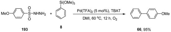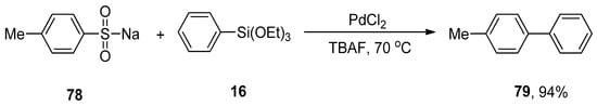 Cheng et al. disclosed a PdCl2-catalyzed Hiyama-type coupling of arenesulfinates and organosilanes in mild reaction conditions. A wide range of substituted biaryls was obtained in 73–94% yield by coupling various arenesulfinates with aryl trialkoxysilanes. The coupling of p-methylbenzenesulfinate 78 with phenyl triethoxysilane 16 was carried out in the presence of PdCl2 (5 mol%) and TBAF (additive) in the THF solvent. The reaction progressed well under aerobic conditions at 70 °C giving the corresponding biaryl product 79 in 94% yield (Scheme 25) [].