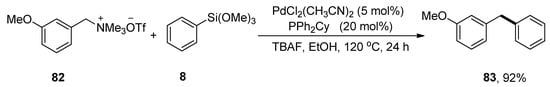 Diarylmethanes have attained huge interest as they exist in biologically active natural compounds and drugs [,]. For example, avrainvilleol, a marine natural product, possesses a diarylmethane motif and exhibits antibacterial [] and antioxidant [] activities. Several drugs containing diarylmethanes demonstrate a wide range of biological activities such as segontin (used to cure coronary heart disease) [], bifemelane, tolpropamine, and piritrexim act as an antidepressant, antiallergic and anticancer agents, respectively [,,,]. Functionalized diarylmethane derivatives were achieved by coupling a variety of benzylic ammonium salts with phenyl trimethoxysilane, as elaborated by Zhao and coworkers in 2019. Methoxy substituted benzyltrimethylammonium salt 82 was treated with phenyl trimethoxysilane 8 to acquire the desired diarylmethane derivative 83 in 92% yield. The reaction proceeded well at 120 °C in the presence of 5 mol% PdCl2(CH3CN)2 catalyst, 20 mol% PPh2Cy ligands, and TBAF in EtOH (Scheme 27). In the case of aryl trimethoxysilanes, the substrate containing electron-donating groups afforded corresponding diarylmethane derivatives in (57–97%) yield range. Moreover, the substrate-bearing heterocycles, including thiophene and furan, gave coupling products a 94% yield [].