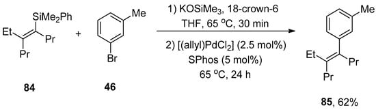 Synthesis of vinylsilanes is a very promising task in research due to their spacious applications in organic syntheses, such as the Hiyama coupling reaction []. Wisthoff et al. designed a facile protocol to accomplish the synthesis of cis- or trans-tetrasubstituted vinylsilanes via carbosilylation of three components, including symmetrical alkynes, alkyl zinc iodides, and iodosilanes using a palladium catalyst. The authors also reported conditions for tetrasubstituted vinylsilanes via the Hiyama coupling reaction that facilitated the synthesis of tetrasubstituted alkenes. The cis- or trans-tetrasubstituted vinylsilanes were synthesized in a 32–97% yield range by the addition of iodosilane to the solution of alkyl zinc iodide and alkyne using (Ph3P)2PdCl2 (2 mol%) catalyst in dioxane. Triethylamine (Et3N) was reported as a suitable base for this reaction. Tetrasubstituted vinylsilanes underwent Hiyama cross-coupling reactions to achieve the stereodefined tetrasubstituted alkenes. The reaction of 84 with 1-bromo-3-methybenzene 46 was conducted in the presence of KOSiMe3, and 18-crown-6 in THF at 65 °C, followed by the treatment with 2.5 mol% [(allyl)PdCl2] catalyst and 5 mol% SPhos ligands at 65 °C afforded the desired geometrically defined tetrasubstituted alkene 85 in 62% yield (Scheme 28). The effect of ligands on the selectivity of alkyl-substituted tetrasubstituted vinylsilanes was also observed. It was found that the use of DrewPhos ligand 86 (Figure 2) gave results in (54–92%) yield of alkyl-substituted tetrasubstituted vinylsilanes with excellent syn-selectivity while using JessePhos 87 (Figure 2) as ligand resulted in 61–92% yield range of alkyl-substituted tetrasubstituted vinylsilanes with excellent anti-selectivity [].
