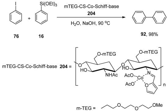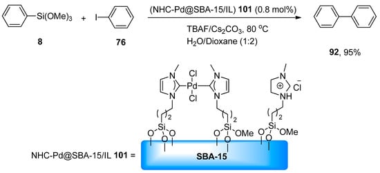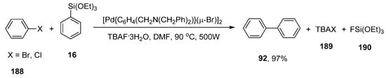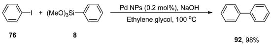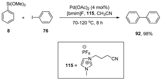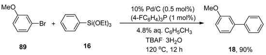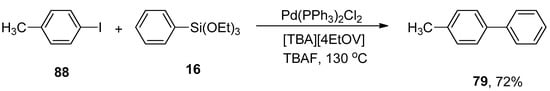 γ-Valerolactone-based tetrabutylphosphonium 4-ethoxyvalerate are effective and versatile biomass-derived ionic liquids and have been extensively utilized in synthesis protocols due to their tunability. In order to elaborate on the effect of ionic liquid, Orha et al. outlined the efficient synthesis of substituted biaryl derivatives by the addition of iodoaromatic substrates to triethoxyphenylsilane. In this methodology, reactions of several aryl iodides were performed with triethoxyphenylsilane to give numerous substituted biaryl structures in good yields (45–72%). 1-Iodo-4-methylbenzene 88 was coupled with triethoxyphenylsilane 16 in tetrabutylphosphonium 4-ethoxyvalerate [TBA][4EtOV] afforded the desired biaryl derivative 79 in 72% yield. The reaction was carried out at 130 °C using Pd(PPh3)2Cl2 as catalyst precursor and a fluoride source (TBAF) to activate the transmetalation reagent (Scheme 29) [].