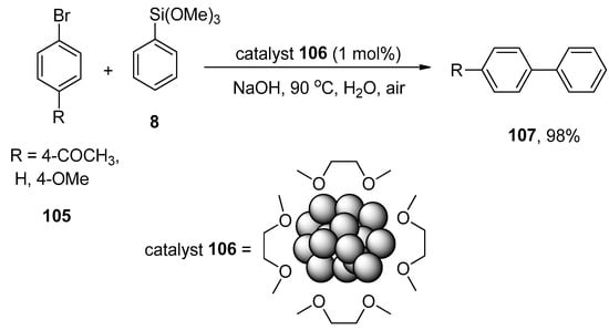 - Ohtaka, A.; Kotera, T.; Sakon, A.; Ueda, K.; Hamasaka, G.; Uozumi, Y.; Nomura, R. Fluoride-Free Hiyama Coupling Reaction Catalyzed by Linear Polystyrene-Stabilized PdO Nanoparticles in Water: Specific Reactivity of PdO Nanoparticles over Pd nanoparticles. Synlett 2016, 27, 1202–1206. [Google Scholar] [CrossRef]