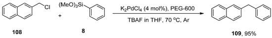 - Srimani, D.; Bej, A.; Sarkar, A. Palladium nanoparticle catalyzed Hiyama coupling reaction of benzyl halides. J. Org. Chem. 2010, 75, 4296–4299. [Google Scholar] [CrossRef]
