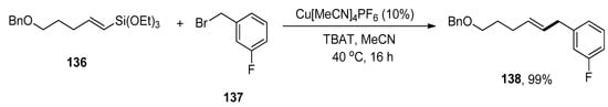 - Denmark, S.E.; Liu, J.H.C. Silicon-Based Cross-Coupling Reactions in the Total Synthesis of Natural Products. Angew. Chem. Int. Ed. 2010, 49, 2978–2986. [Google Scholar] [CrossRef]