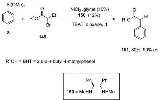- Dai, X.; Strotman, N.A.; Fu, G.C. Catalytic asymmetric Hiyama cross-couplings of racemic α-bromo esters. J. Am. Chem. Soc. 2008, 130, 3302–3303. [Google Scholar] [CrossRef] [PubMed]