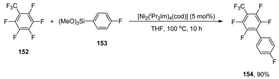 - Saijo, H.; Sakaguchi, H.; Ohashi, M.; Ogoshi, S. Base-Free Hiyama Coupling Reaction via a Group 10 Metal Fluoride Intermediate Generated by C–F Bond Activation. Organometallics 2014, 33, 3669–3672. [Google Scholar] [CrossRef]