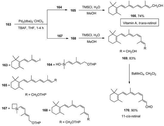 - Montenegro, J.; Bergueiro, J.; Saá, C.; Lopez, S. Hiyama cross-coupling reaction in the stereospecific synthesis of retinoids. Org. Lett. 2009, 11, 141–144. [Google Scholar] [CrossRef] [PubMed]