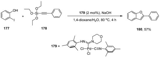 - Singh, C.; Prakasham, A.P.; Ghosh, P. Palladium Acyclic Diaminocarbene (ADC) Triflate Complexes as Effective Precatalysts for the Hiyama Alkynylation/Cyclization Reaction Yielding Benzofuran Compounds: Probing the Influence of the Triflate Co-Ligand in the One-Pot Tandem Reaction. ChemistrySelect. 2019, 4, 329–336. [Google Scholar] [CrossRef]