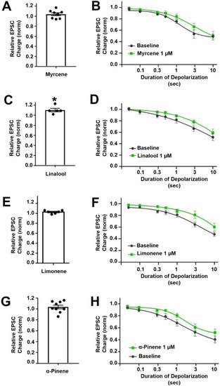 Myrcene, linalool, limonene andα-pinene do not alter cannabinoid signaling in autaptic hippocampal neurons. (A) Myrcene (1 µM) did not alter EPSCs. (B) Myrcene also did not have an effect on DSE responses. (C) Linalool (1 µM) slightly increased EPSCs. (D) However, linalool had no effect on DSE responses. (E) Limonene (1 µM) did not alter EPSC sizes (F) and did not significantly inhibit DSE responses. (G) α-pinene (1 µM) did not alter EPSCs. (H) Similarly α-pinene did not inhibit DSE responses. * p < 0.05 one-sample t-test vs. 1.0 or vs. baseline at 3 s of depolarization. Mean ± SEM shown.