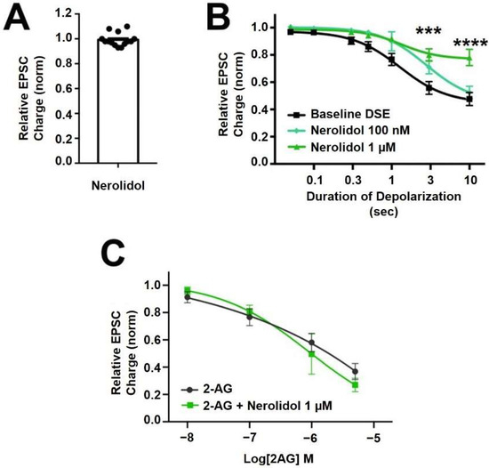 Nerolidol has complex interaction with cannabinoid signaling. (A) Nerolidol (1 μM) does not alter EPSC sizes. (B) Nerolidol substantially inhibits DSE responses at 1 μM but not at 100 nM. (C) 2-AG signaling is not diminished by treatment with nerolidol. *** p < 0.001, **** p < 0.0001 at 3 and 10 s depolarizations via 2-way ANOVA with Bonferroni post hoc test.